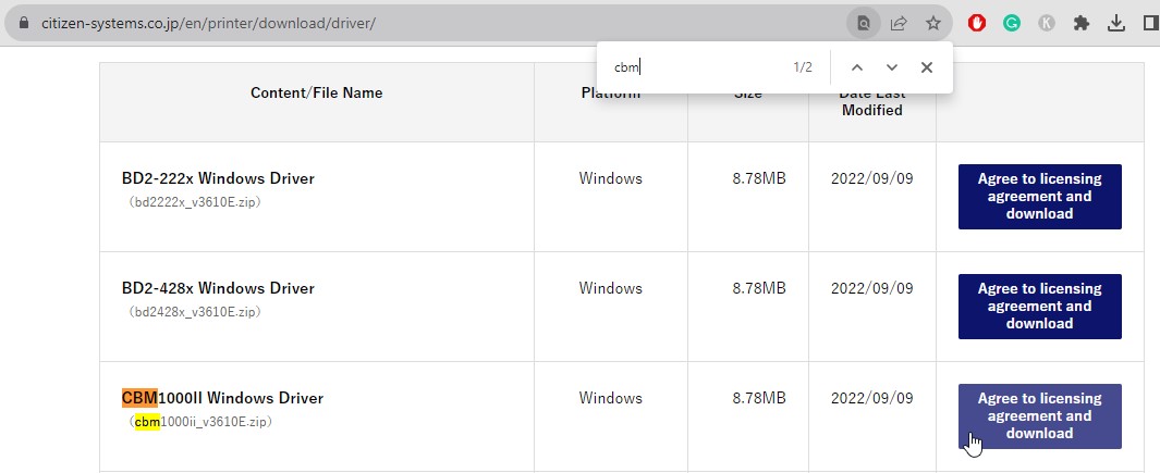 When you open this page, you’ll have to find the necessary drivers from the list. You can find it by pressing the Windows button and symbol F. Win+F will open a Find tool in Windows, so simply type in CBM1000.