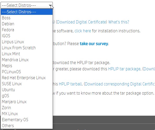 The downloaded zipped folder will contain necessary drivers for WIndows and Mac, while Linux users need to use the developers’ tool. Linux users can get the latest drivers by opening the HP Linux Imaging page and choosing their OS version (see screenshot).